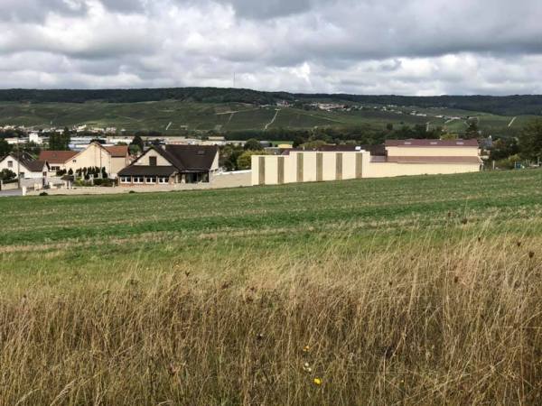 Looking toward the Mardeuil, France winery buildings of biodynamic Champagne winemaker Vincent Charlot.