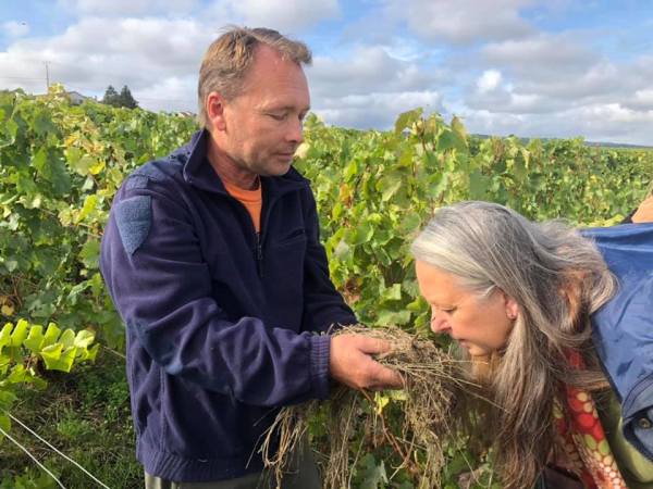 Vincent Charlot, Caroline Henry, and Sue Hill inspect his biodynamic vines.