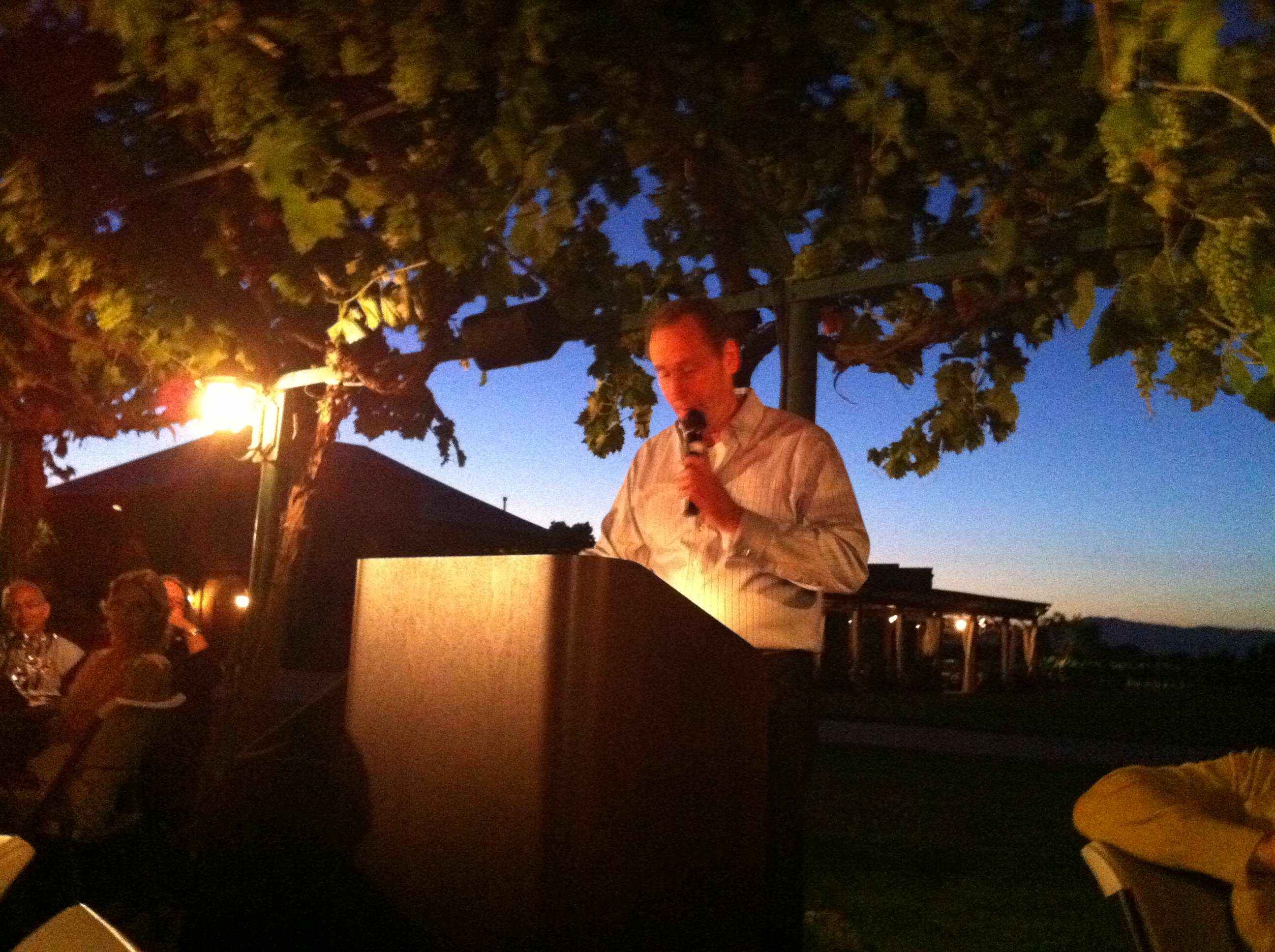 After over three weeks on the road, and tasting wine in Idaho, Walla Walla Washington and the Willamette Valley in Oregon, I made it Monday July 25 to Jim Concannon’s birthday dinner to celebrate his 80th and Petite Sirah at the PS I Love You Petite Sirah Symposium Tuesday July 26 at Concannon Winery in Livermore. (Links to participating wineries and those discussed below the jump; here’s a blog post by Jo Diaz about the events. Pictured below is Jim Concannon’s son John honoring him; pictured above is Karen Leslie who sat next to me).